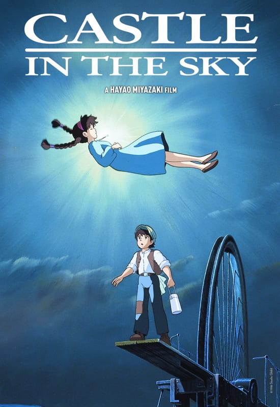 Castle In The Sky- A plane carrying a young girl and her kidnapper is hijacked where she escapes using a magic crystal necklace. She soon meets an orphan boy and embark on a journey to explore the floating city of Laputa while running away from pirates.