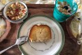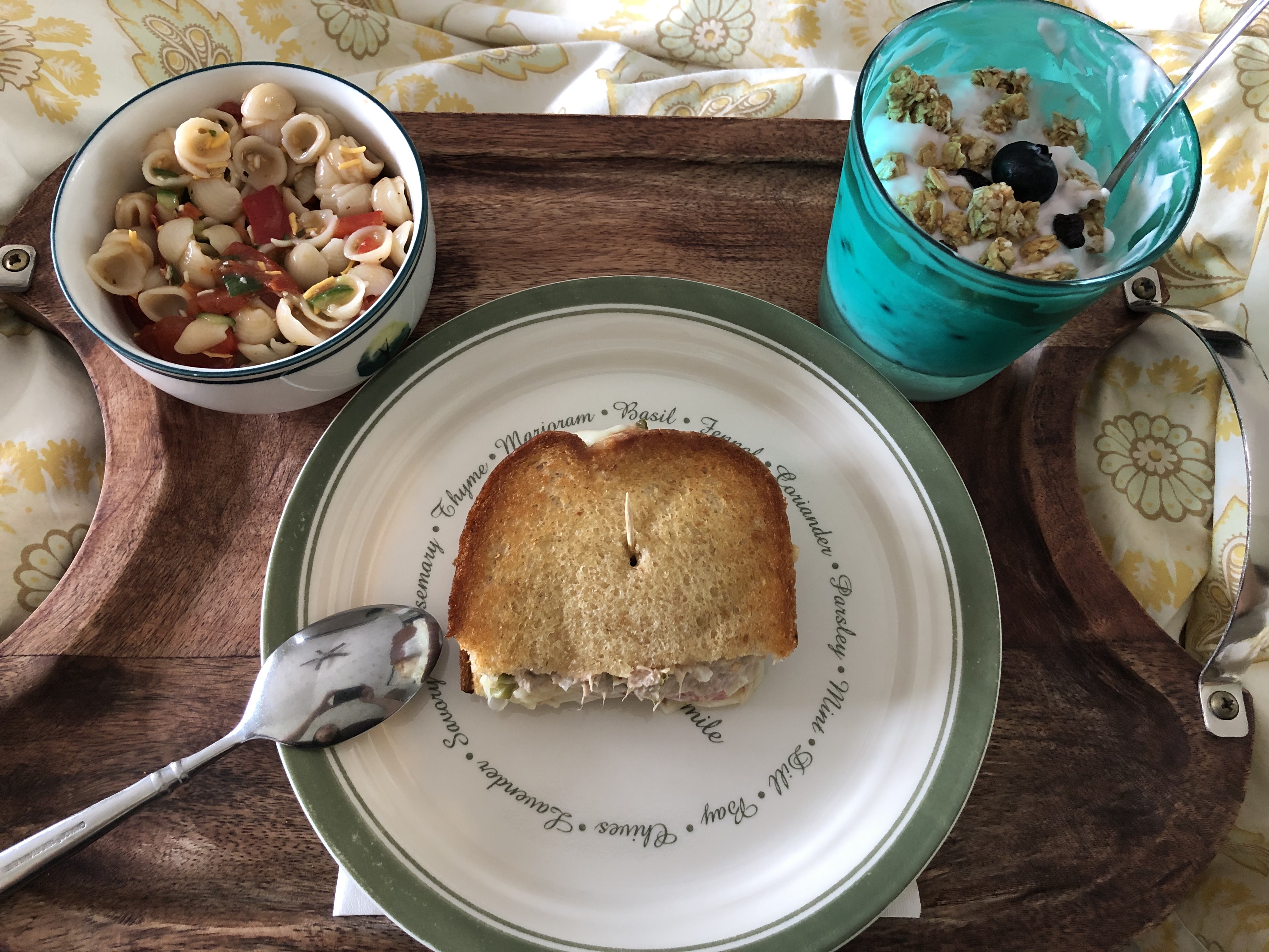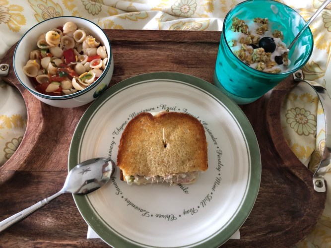 Tuna melt with a side of pasta salad and greek yogurt with oats and fruits.