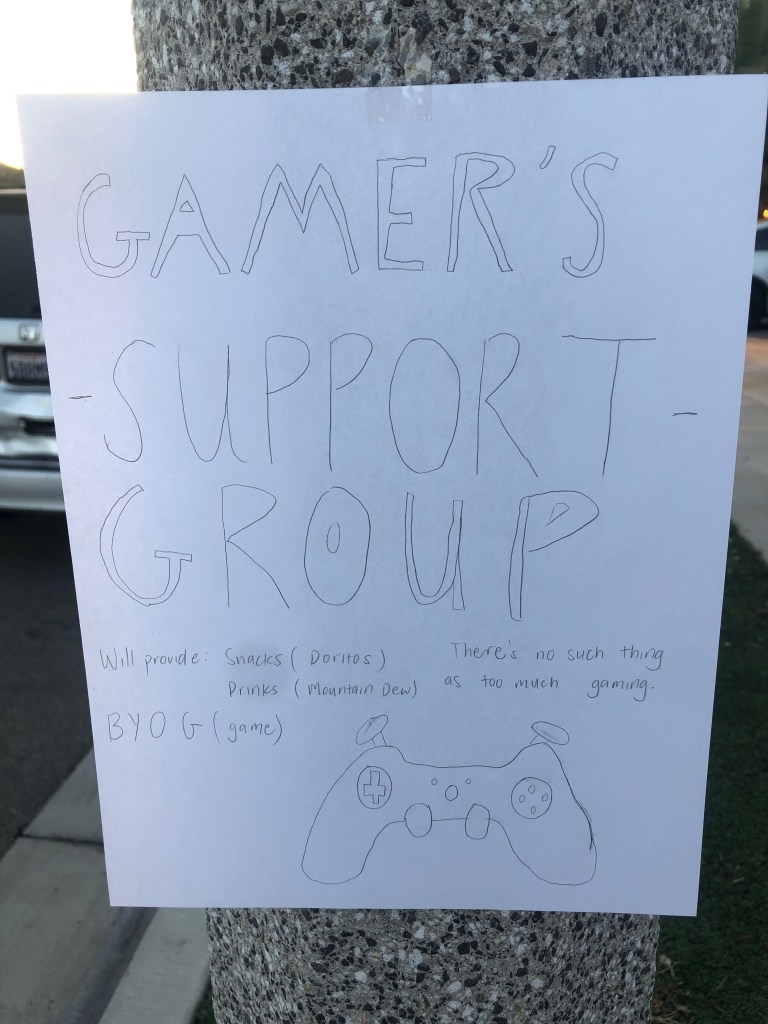For my poster, I made a Gamer’s Support Group. This is a group that would entice people who play a little too much videogames during their free, and no so free time. However, the irony of this is that rather than helping us play videogames less, it encourages us to play more.