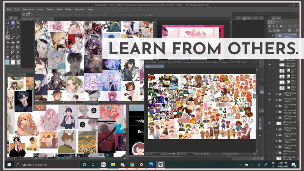 Personally, I love to study and learn from other artists who I adore. This is a quick look into some of the background research I do for my artworks; Each piece of mine, although may depict only one scene with a singular character, comes with a behind the scenes containing hundreds of references, study boards, and inspirations all collaged together. There’s a great sense of fulfilment you can gain from studying and developing something you truly care about.