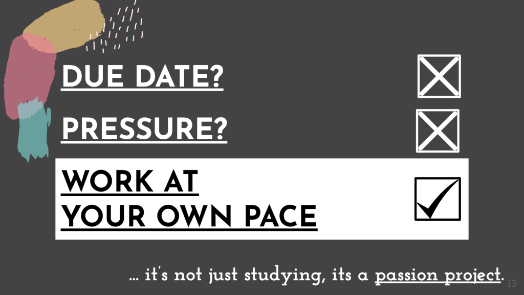 You can see it like that, but I see it differently. There are no due dates, and no pressure in digital art. You can learn, study, and devote yourself at your own pace. It’s not just studying, it’s a passion project. It’s healthy to allow yourself something of your own to study and learn separate from the heavy deadlines of school. Centering yourself and allowing yourself to focus on something else, something completely unattached from school, can prove to be incredibly uplifting.