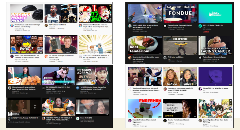 To show the diversity, I asked 9 of my friends for their favorite things to watch on YouTube, and they each had different answers. The genres ranged from mukbangs, games like Valorant and Minecraft, K-pop, educational videos like Crash Course, baking videos from Tasty, makeup videos, cooking videos, and lifestyle vlogs.