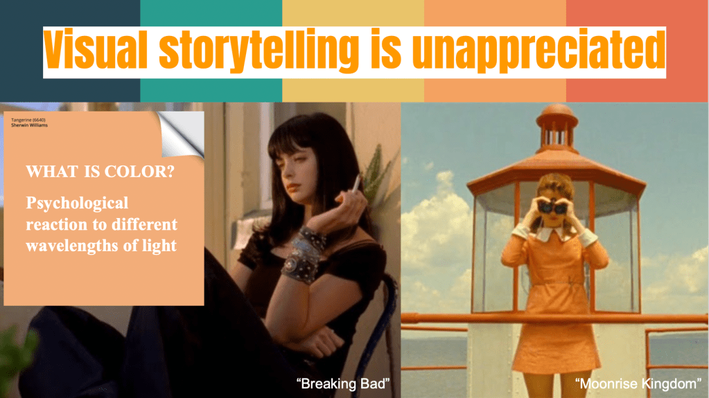 Many people don’t understand the vast part color plays in creating a good film. Without putting thought into the colors used, it can create something visually confusing and incoherent. No one can even describe color because technically speaking it is our psychological reaction to different wavelengths of visible light. It’s how we visually perceive our reality.