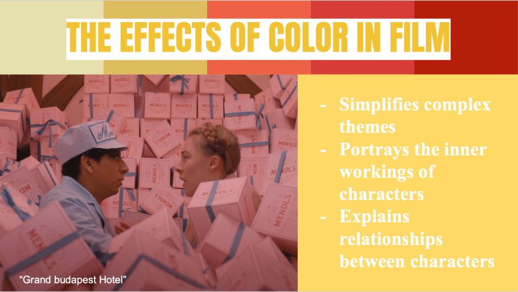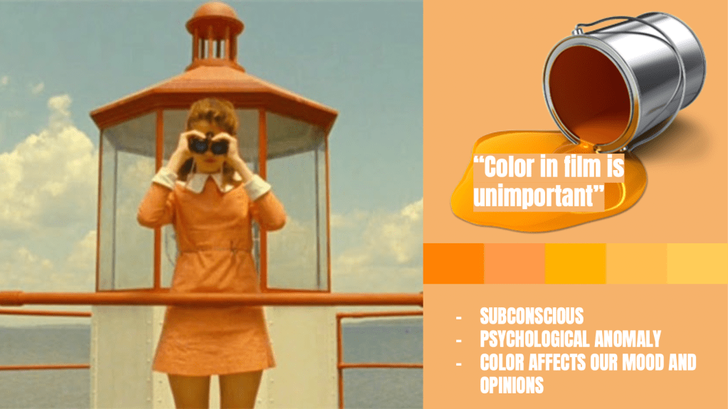 There are no guidelines on how filmmakers use color and they don’t need to be psychologists. Great film makers like Wes Anderson rely on their instinct and ideas. And their ideas can be explained through color in order to create amazing films
