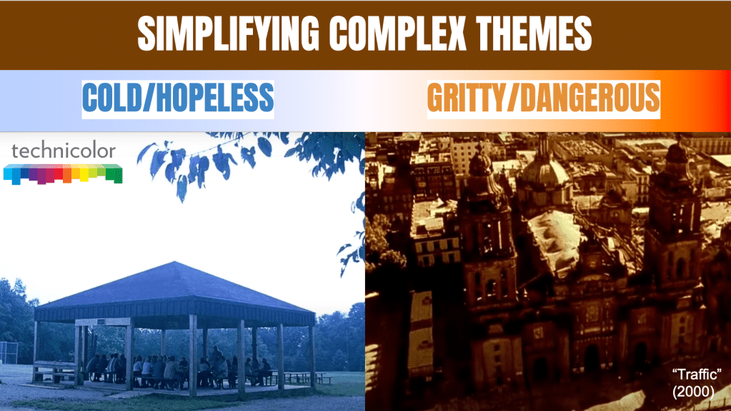Before technicolor, films were hand tinted because even back then people understood the importance of using color to tell a story! Once technicolor was introduced, however, it changed film forever. Color is used to set atmosphere for the particular stories. Whether the tone is cold and hopeless or gritty and dangerous, we will always have innate psychological reactions to colors.