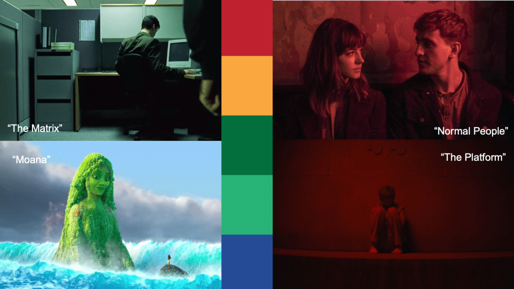 Color doesn’t have just one meaning, either. For example, depending on the context, red can be used as a depiction for hate and cruelty while it can also be seen as passion and love. Just as green can depict mundane activities as well as freeing nature.