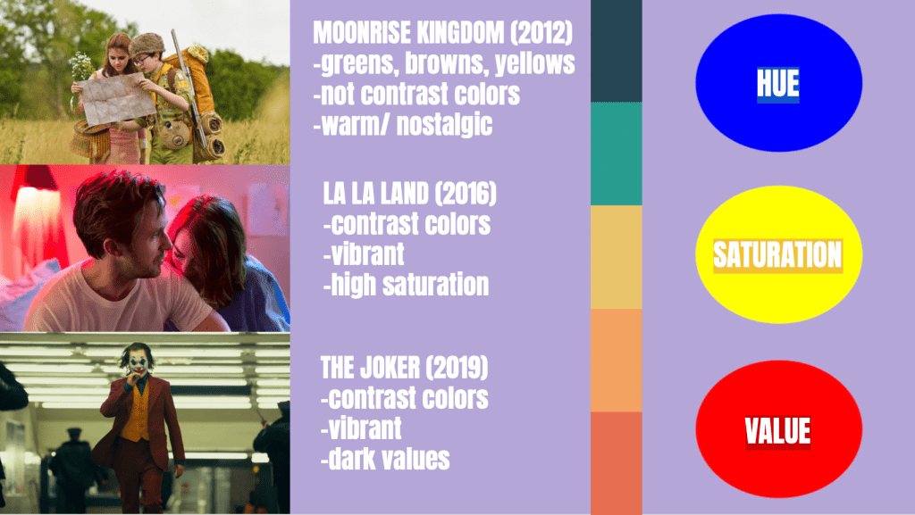 On the opposite end of that, films like La la land use contrasting vibrant color schemes to create a more upbeat environment. And the movie the Joker used contrasting colors but with darker values to create a dark atmosphere.