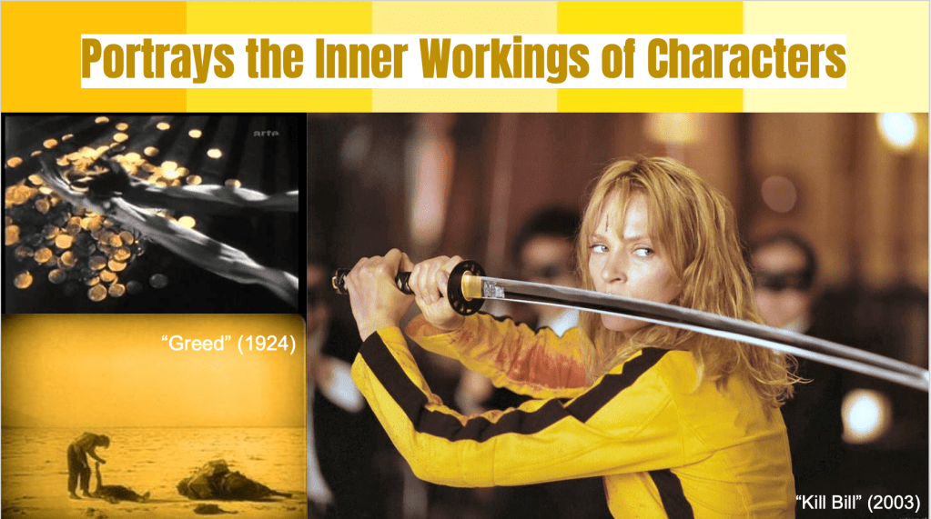 In the movie Greed (1924), money is the only thing hand tinted yellow in the beginning of the film. However by the end, the whole film is tinted yellow representing how greed consumed the main character.