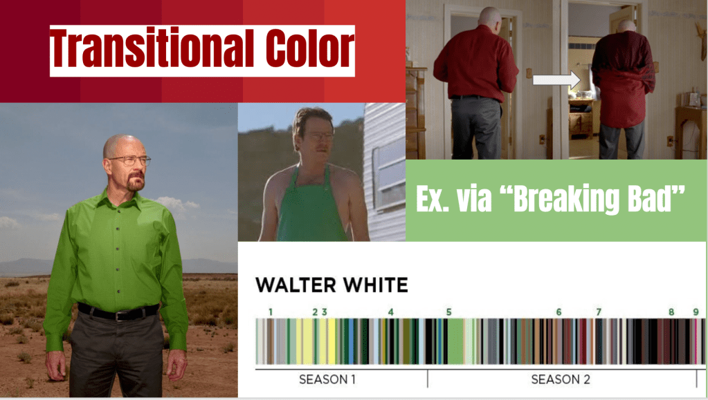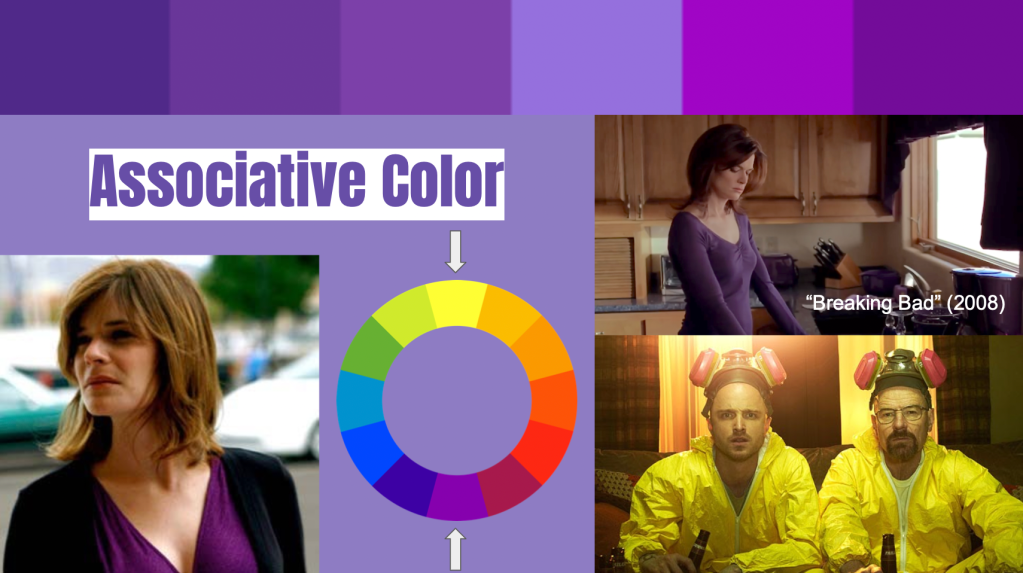 Breaking Bad also uses the concept associative color. Single consistent colors in a story are used as associations of characters or an idea.