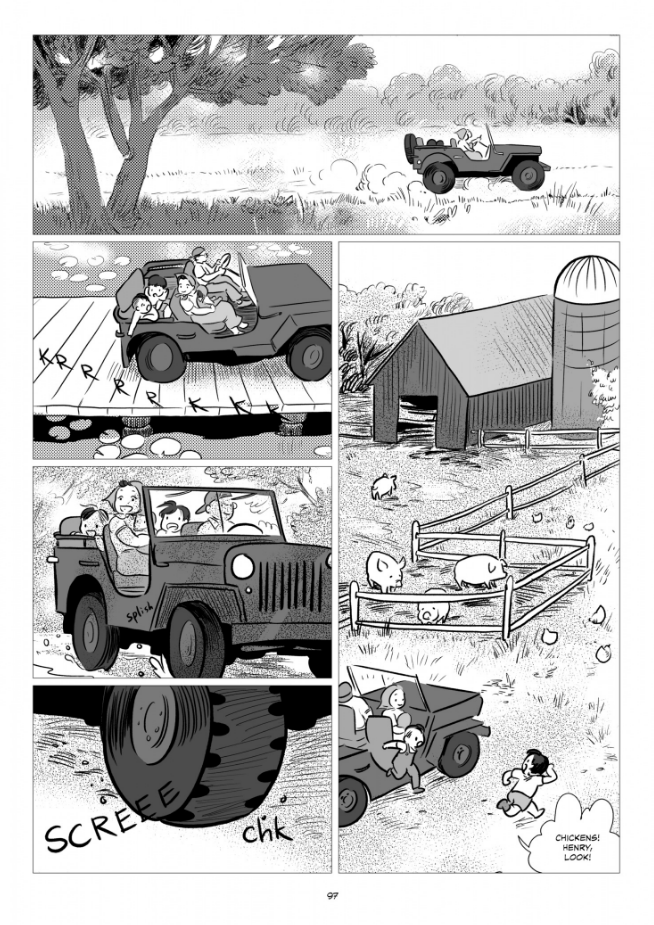 This one moment, which is seen very early on, was one which stuck with me throughout the entirety of the novel. There are no words available to truly describe the heartbreaking feeling of a child who too finds themselves crying after seeing their mother cry for a sorrow not yet fathomable for them. And yet, through the medium of images on a graphic novel page, these emotions are perfectly captured. Not only is the art gratifying, but it’s the way in which the illustrator separates and captures the moments in sequence which truly moves the reader. The well positioned panels and framing, and the pauses in time between what is captured and what isn’t is altogether truly an art in itself.