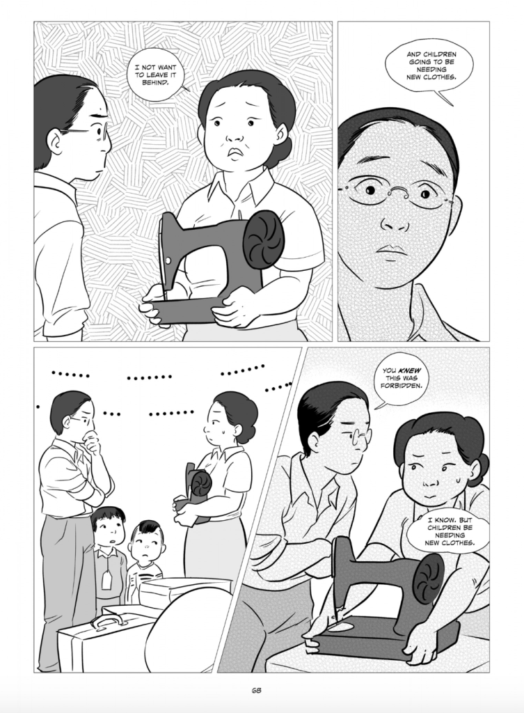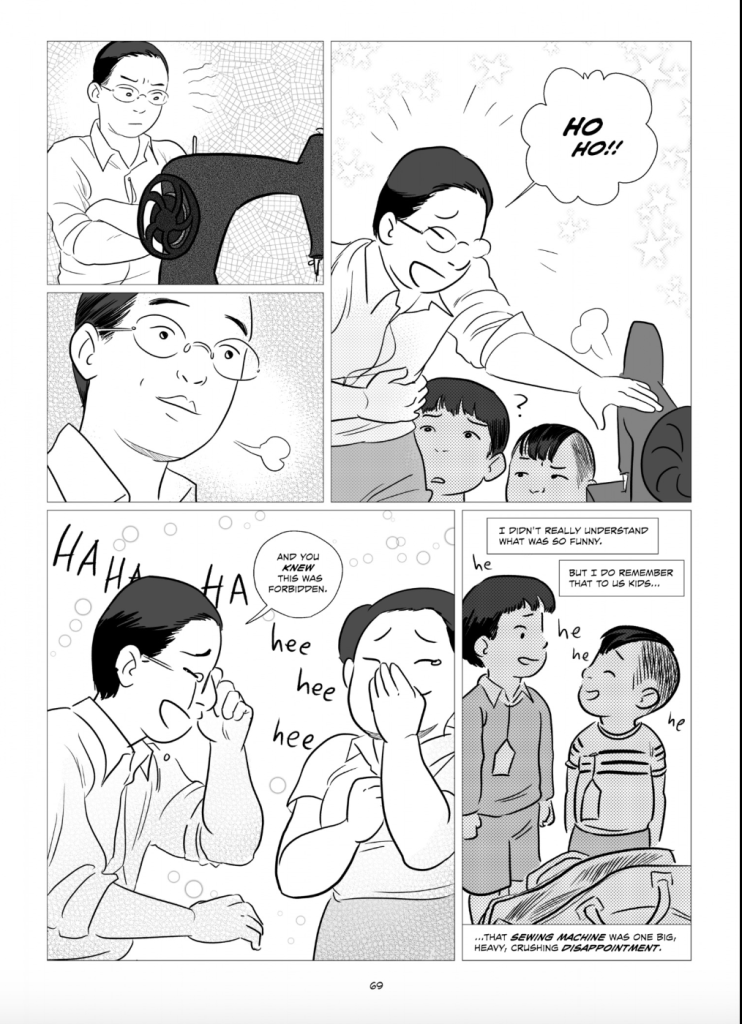 On pages 68-69, the author purposely has the father mention how the sewing machine was forbidden twice. It signifies the first sign of defiance and control. After losing everything from their normal lives, the parents laughed believing that they had one little victory for their family.