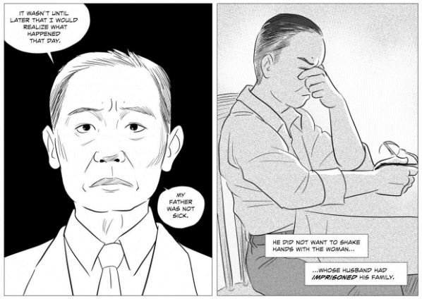 George Takei’s graphic novel, They Called Us Enemy, details his and his family’s experience before, during, and after their internment. A scene on pages 180 through 182 depicts Takei’s father refusing to shake the hands of Mrs. Eleanor Roosevelt, wife of Franklin D. Roosevelt. This is contrasted with everyone else in the building, including George himself, choosing to do so. George’s father made his decision because he could not forgive her husband, who ordered the internment of his family and thousands of others.